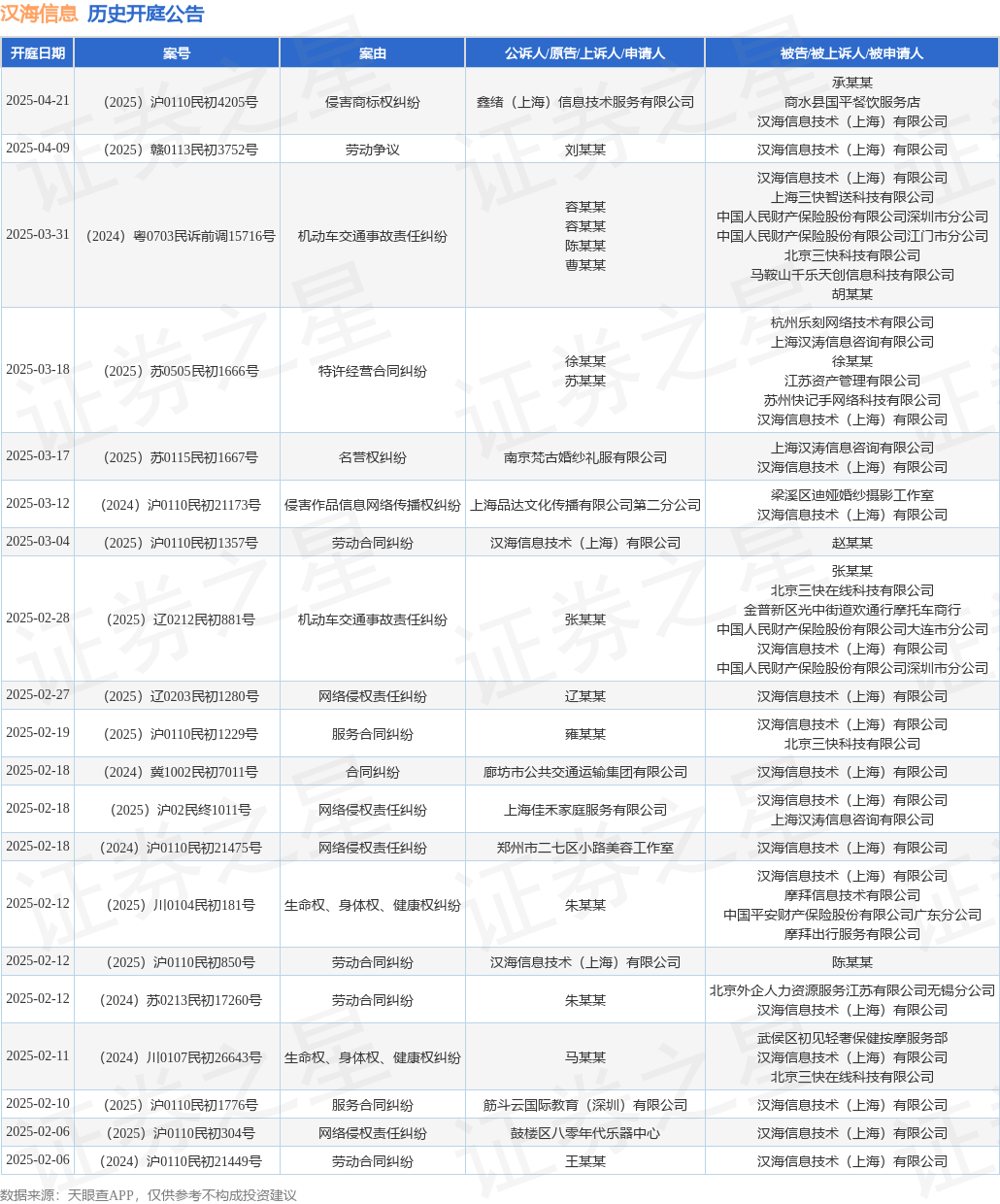 案号:(2025)沪0110民初1229号审理法院:上海市杨浦区人民法院案由:服务合同纠纷当事人信息: 原告/上诉人:雍某某 被告/被上诉人:汉海信息技术(上海)有限公司、北京三快科技有限公司开庭日期:2025年2月19日根据统计,近一年内以汉海信息技术(上海)有限公司为当事人的历史开庭公告有121则,其中案由为“劳动合同纠纷”的公告以31则居首,其次为“服务合同纠纷”有14则,“网络侵权责任纠纷”有14则。历史开庭公告(前20条)如下: